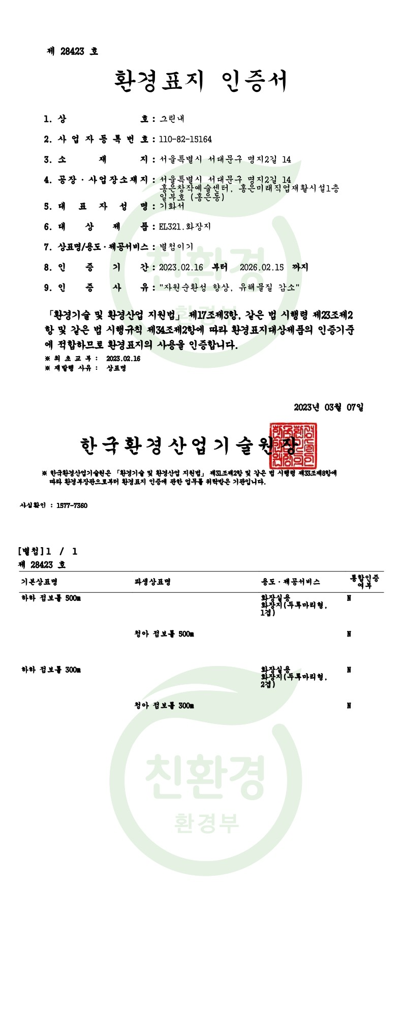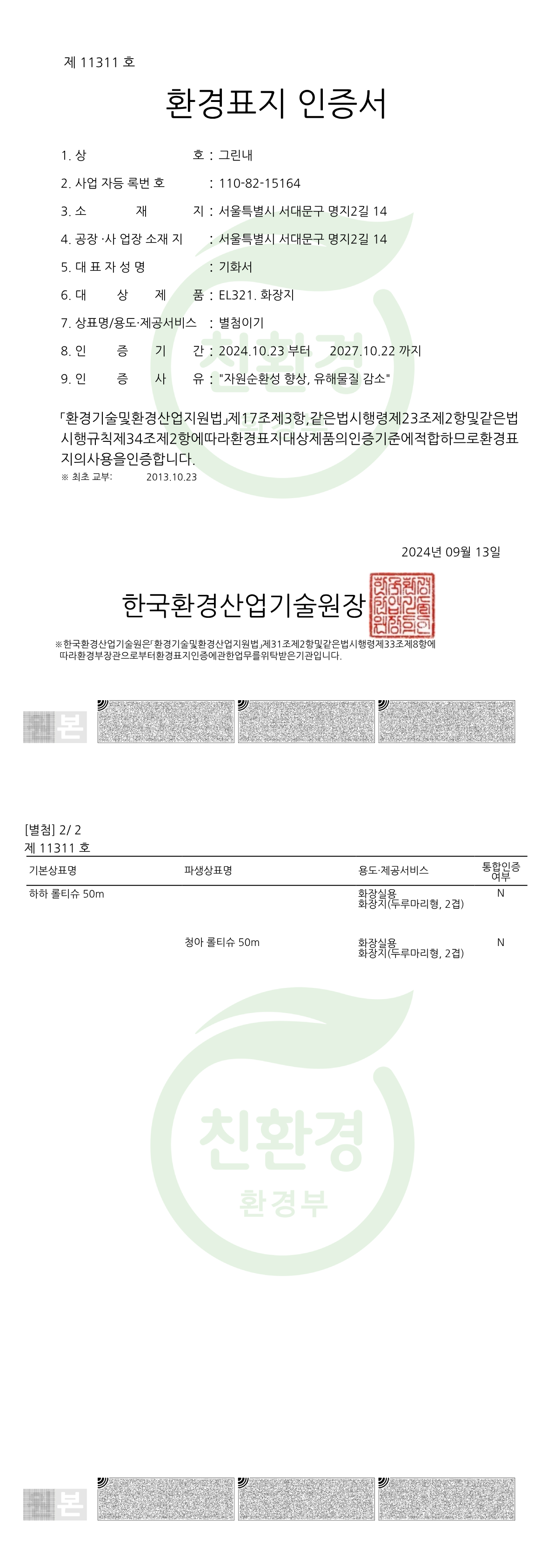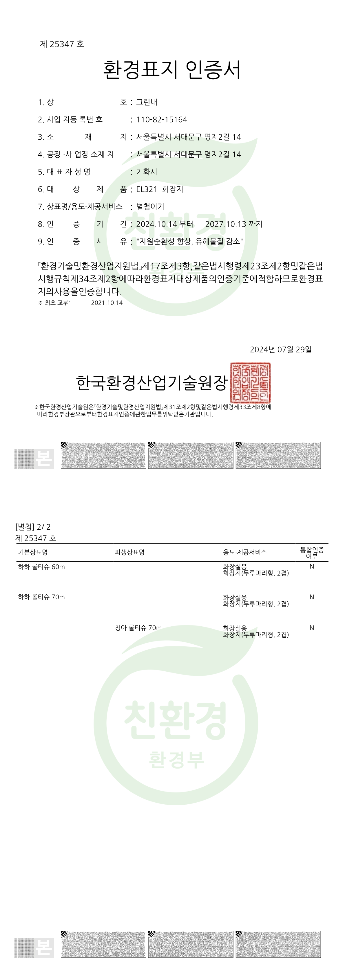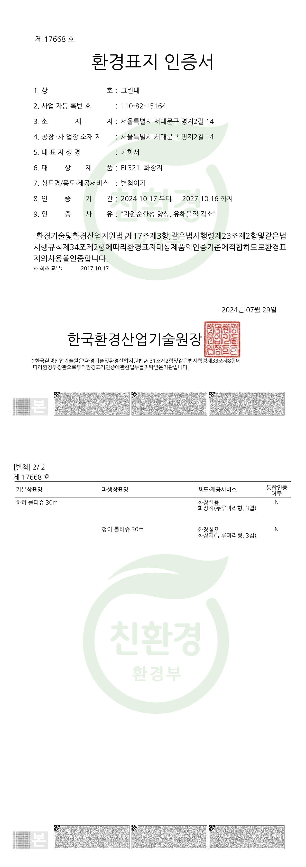 환경인증사유 : 고지사용률 100%, 제조공정상 형광증백제 및 염소산물질 미사용