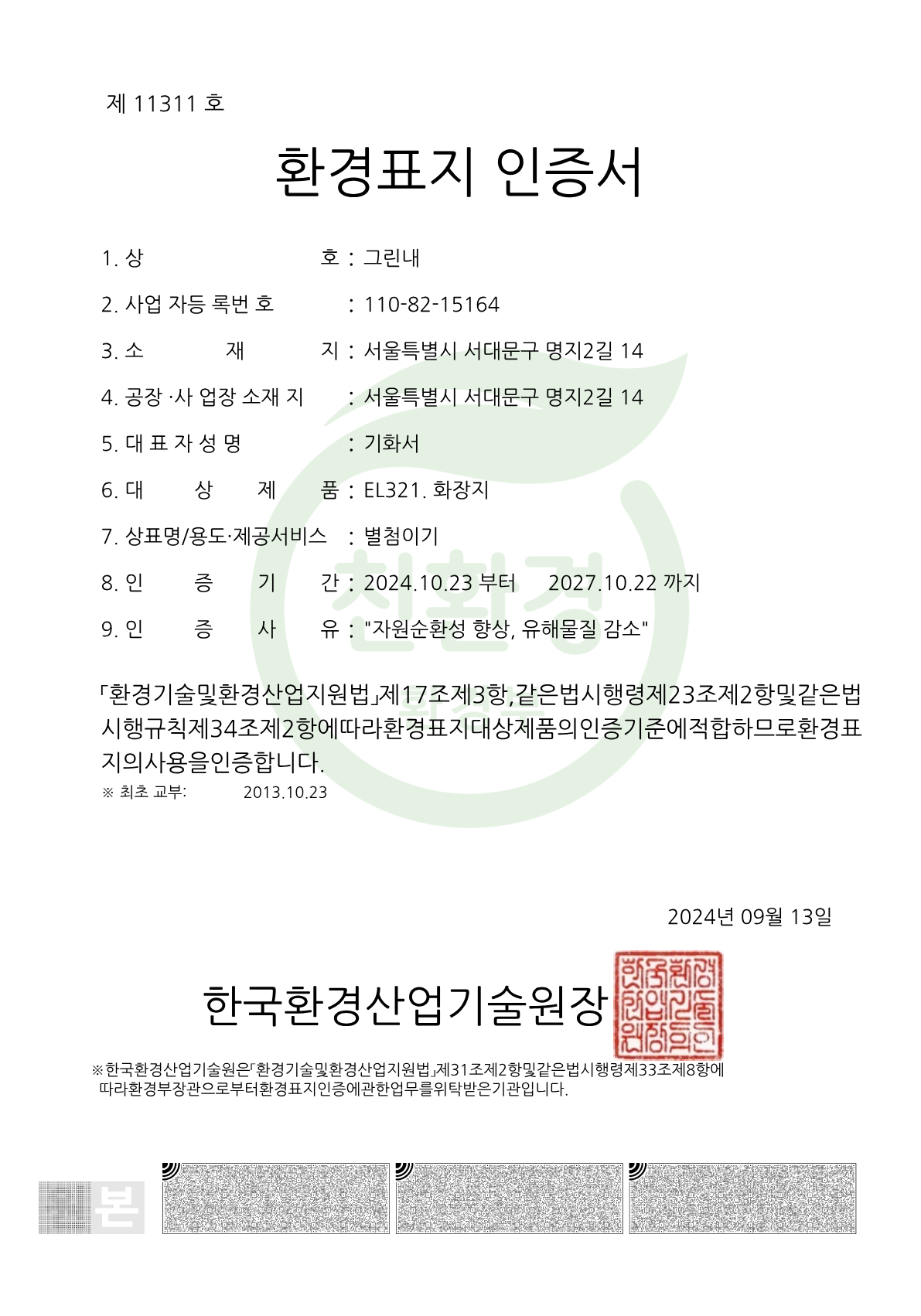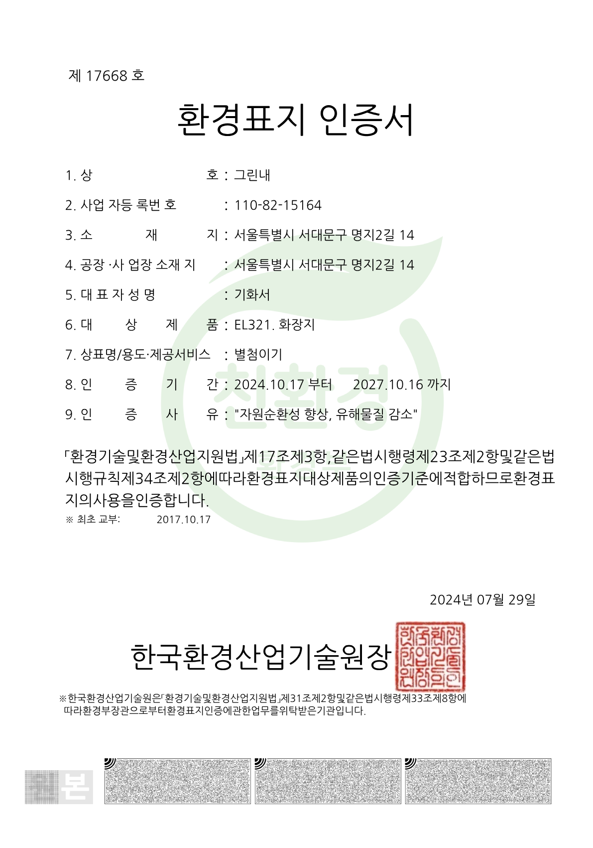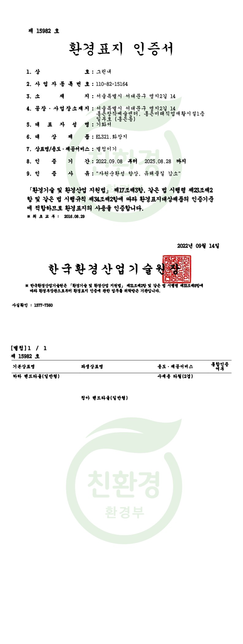환경인증사유 : 고지사용률 100%, 제조공정상 형광증백제 및 염소산물질 미사용