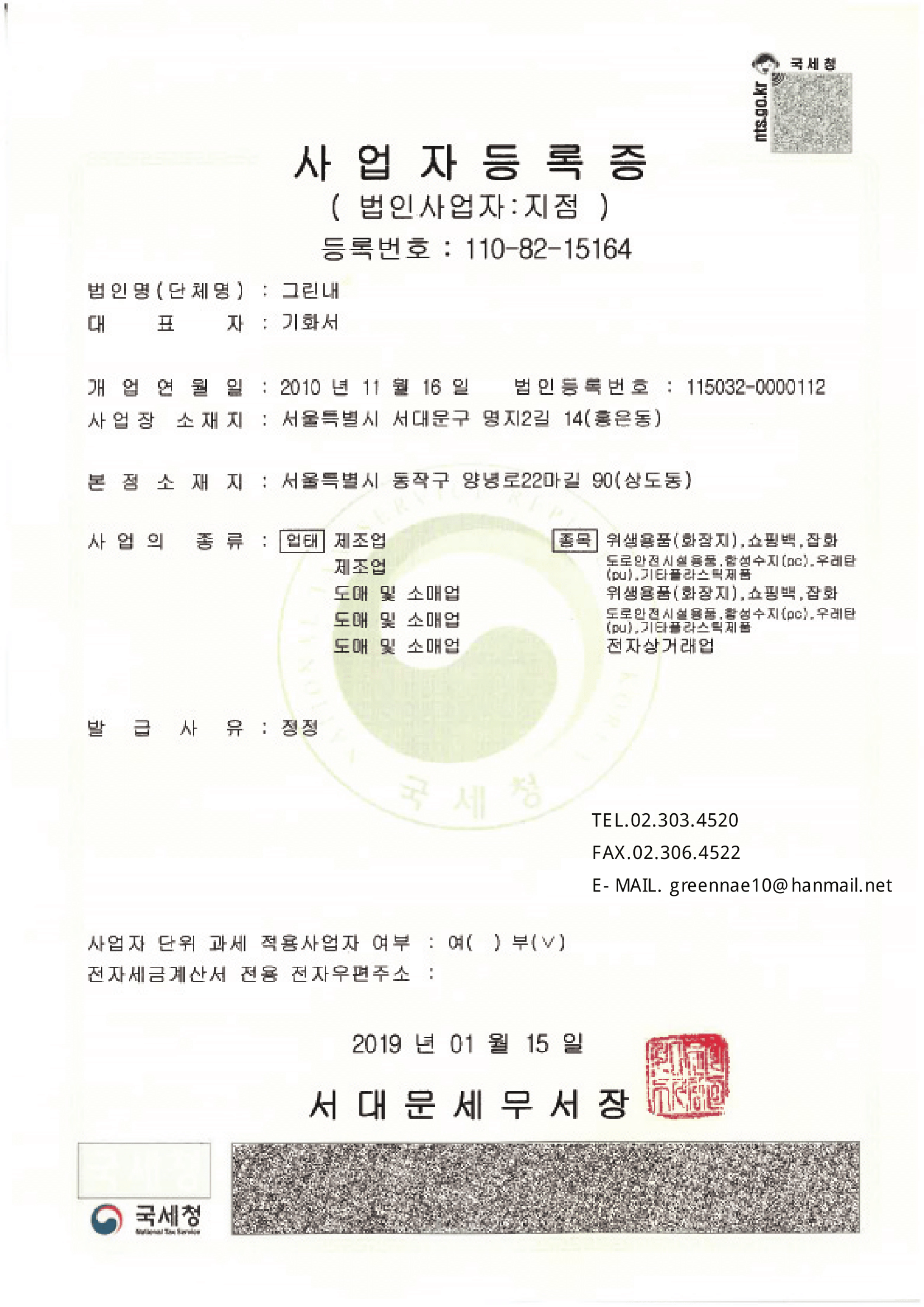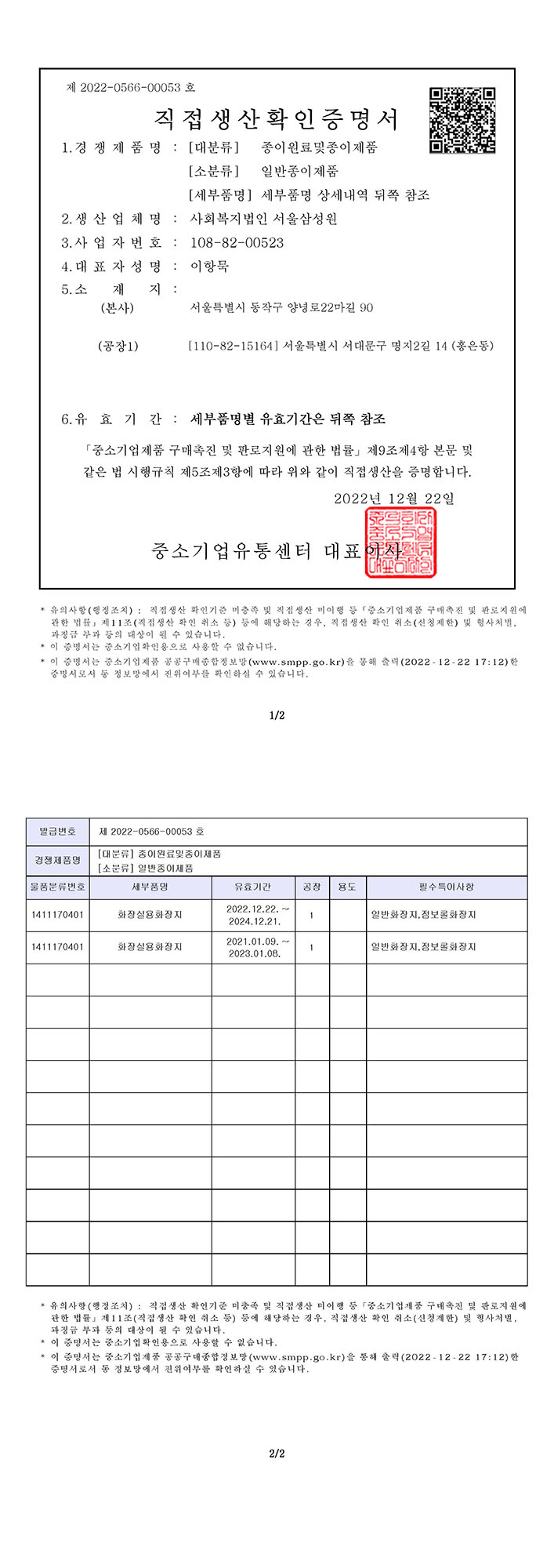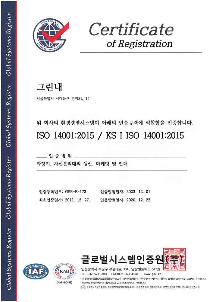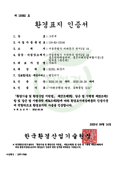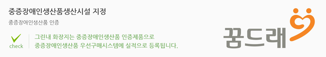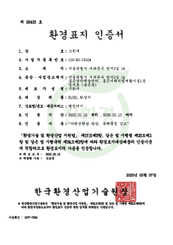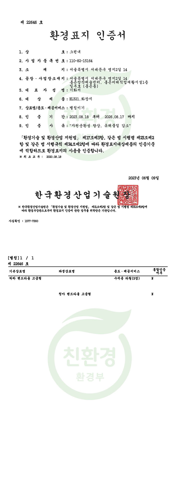 환경인증사유 : 고지사용률 100%, 제조공정상 형광증백제 및 염소산물질 미사용